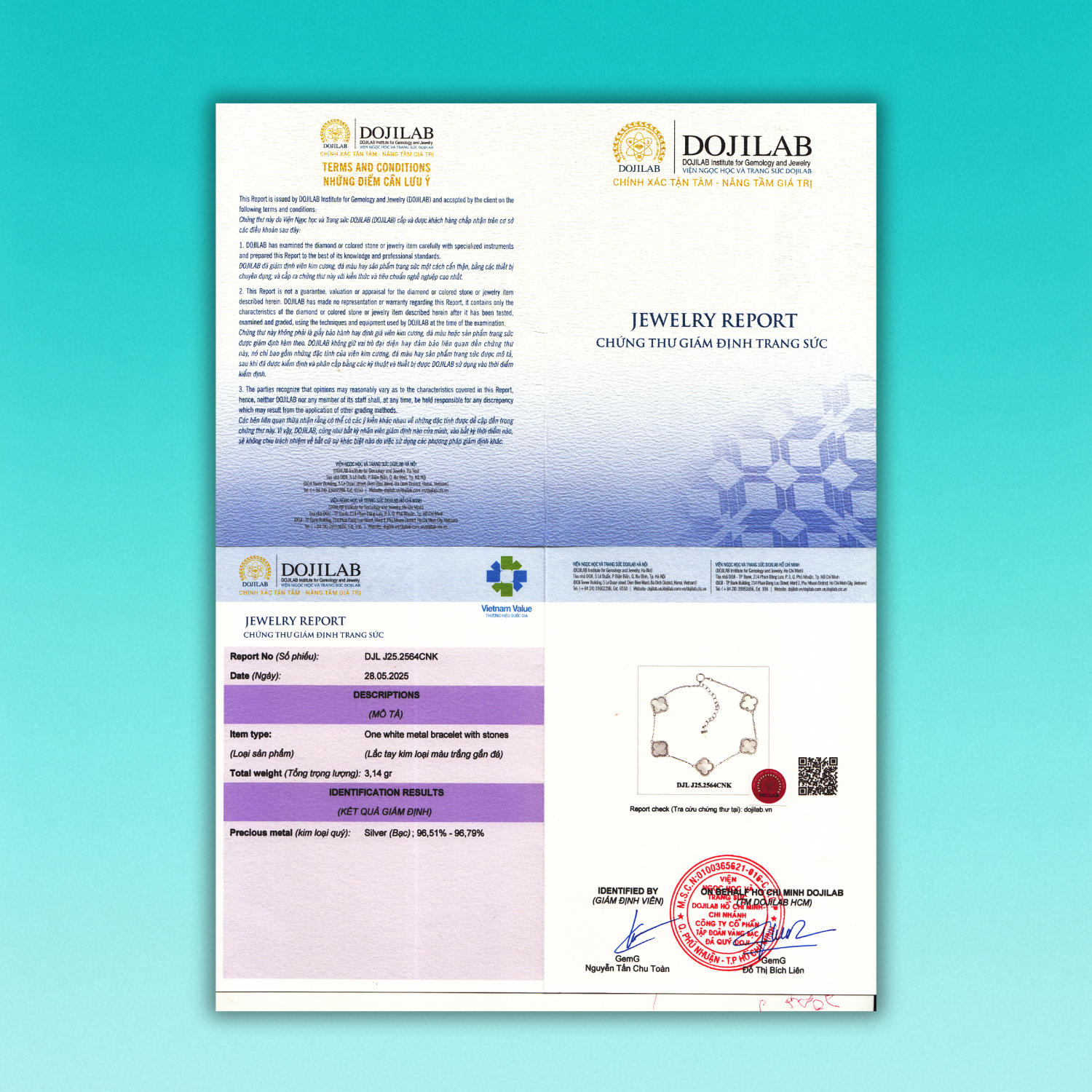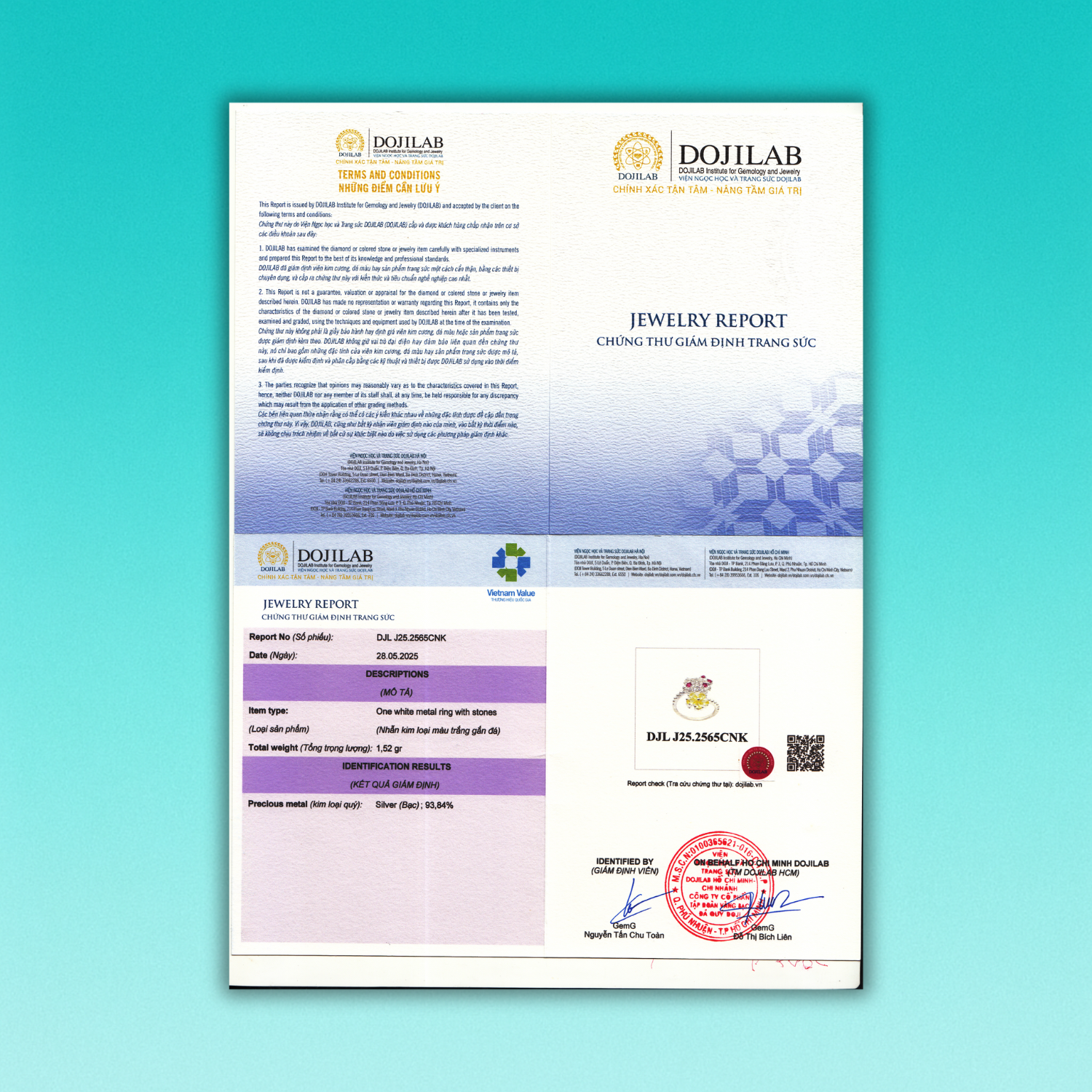 Sản phẩm bạc của Art Jewelry là bạc 925 cao cấp và toàn bộ đều xi kim. Với mỗi nhà cung cấp, Art Jewelry đều kiểm định hàm lượng bạc bởi Doji Lab