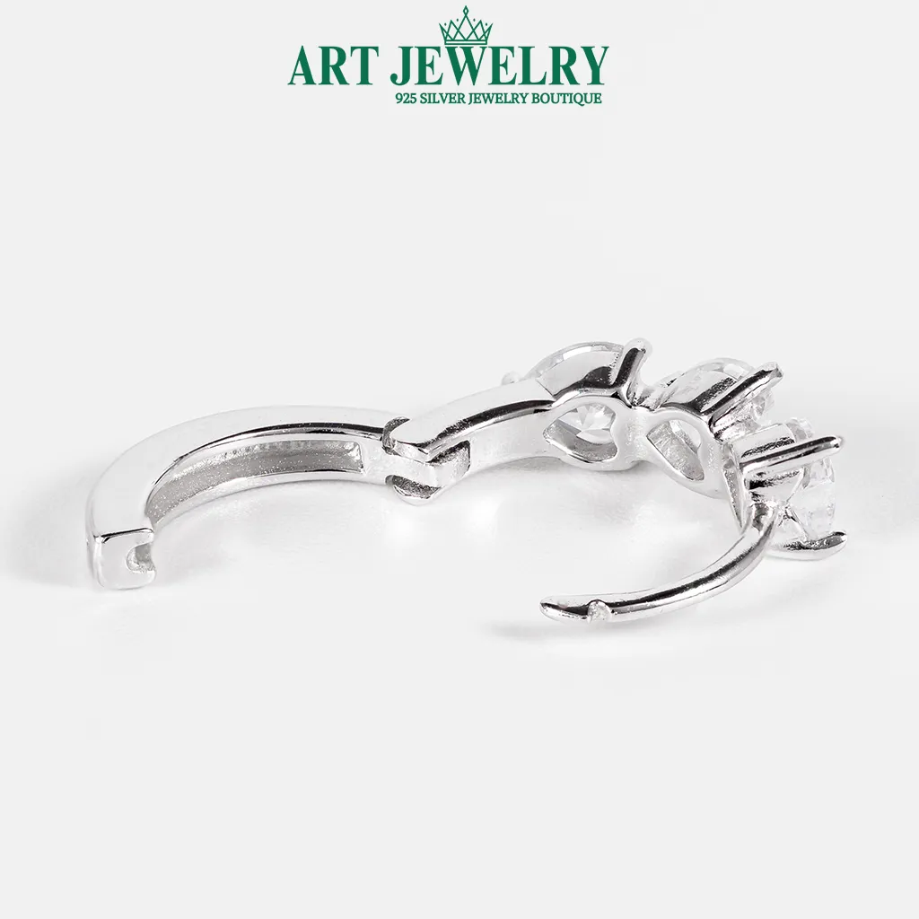 Bông tai 3 đá trái tim khoen bật bạc 925 mang vẻ đẹp ngọt ngào và lãng mạn. Thiết kế dạng khoen bật tròn chắc chắn, thao tác đeo/tháo dễ dàng. Điểm nhấn nằm ở 3 viên đá CZ cắt hình trái tim được xếp liền nhau, tượng trưng cho tình yêu, niềm tin và hy vọng. Các viên đá đa sắc hoặc đồng màu (tùy mẫu) bắt sáng lung linh, tôn lên nét nữ tính dịu dàng nhưng vẫn trẻ trung hiện đại.