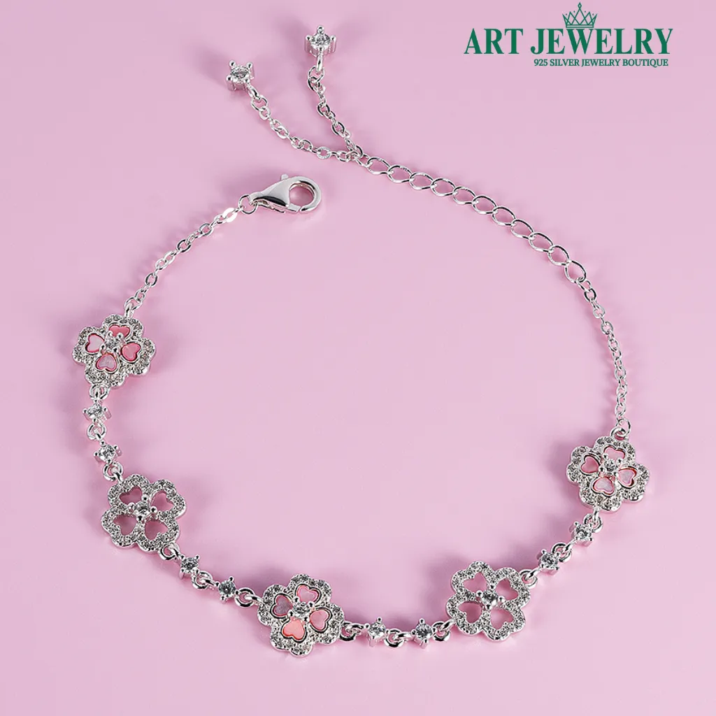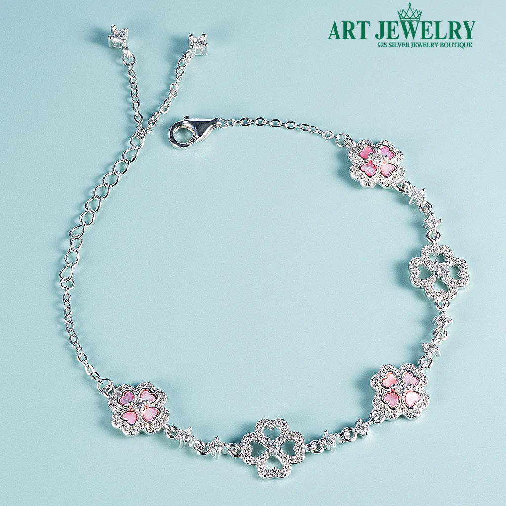Lắc tay cỏ bốn lá tim khảm đá hồng bạc 925 mang đến vẻ dịu dàng, tinh tế nhưng vẫn rất hiện đại. Biểu tượng cỏ bốn lá với cánh hình tim được khảm đá hồng trong trẻo, phản chiếu ánh sáng nhẹ nhàng giúp cổ tay rạng rỡ mà không phô trương. Chất liệu bạc 925 kết hợp lớp xi kim giữ bề mặt sáng bóng, hạn chế xỉn màu và dễ vệ sinh khi đeo thường xuyên.