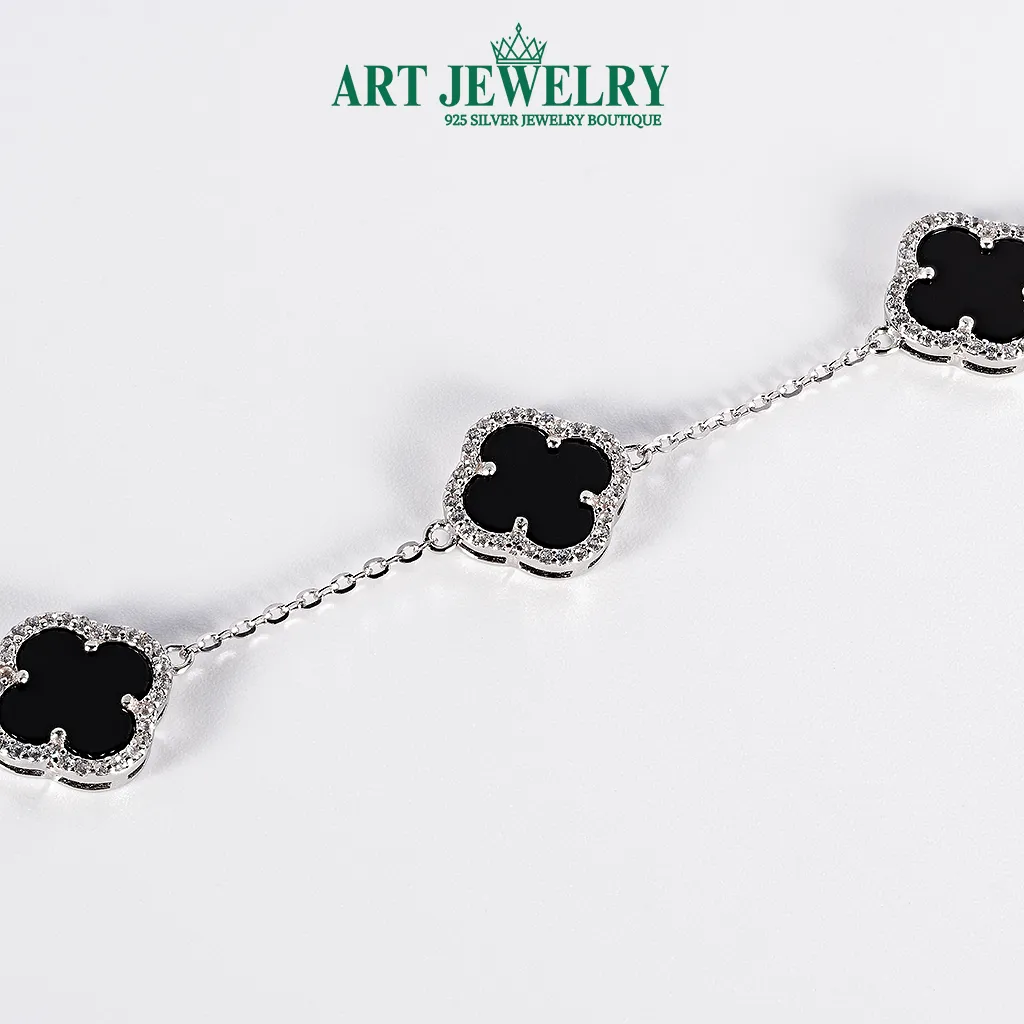 Lắc tay cỏ bốn lá đá đen 10mm viền CZ bạc 925 kết hợp vẻ tối giản thanh lịch với điểm nhấn cá tính từ tâm đá đen kích thước 10 mm. Họa tiết cỏ bốn lá được tạo hình cân đối; vòng viền Cubic Zirconia (CZ) sáng trong ôm trọn tâm đá, tạo tương phản bắt sáng tinh tế nhưng không phô trương. Chất liệu bạc 925 phủ xi kim giúp bề mặt luôn sáng bóng, hạn chế xỉn màu và dễ vệ sinh khi đeo thường xuyên.