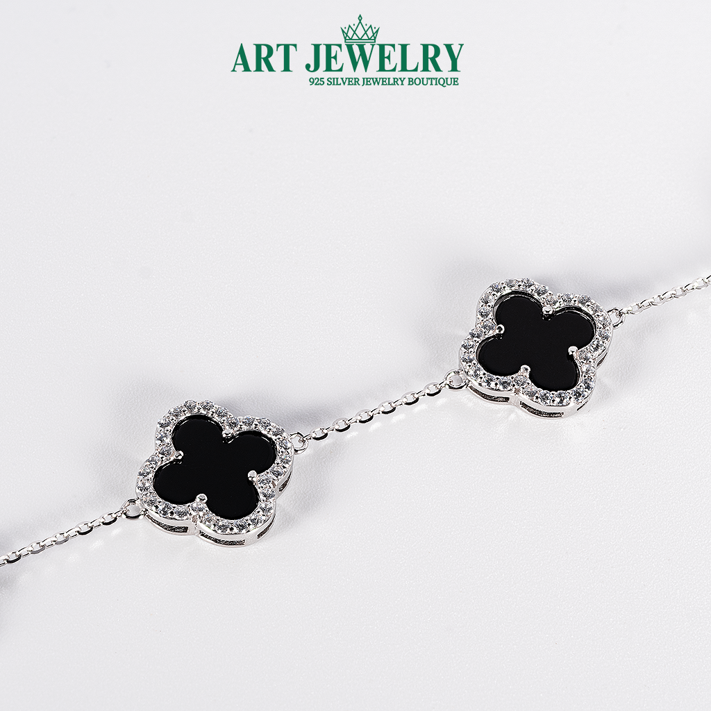 Lắc tay cỏ bốn lá đá đen 12mm viền CZ bạc 925 kết hợp nét tối giản thanh lịch với điểm nhấn mạnh mẽ từ tâm đá đen. Họa tiết cỏ bốn lá được tạo hình cân đối; phần trung tâm là đá màu đen, bao quanh bằng viền Cubic Zirconia (CZ) sáng trong, tạo tương phản đẹp mắt và hiệu ứng bắt sáng tinh tế. Chất liệu bạc 925 cùng lớp xi kim giúp bề mặt luôn sáng bóng, hạn chế xỉn màu và dễ vệ sinh khi đeo thường xuyên.