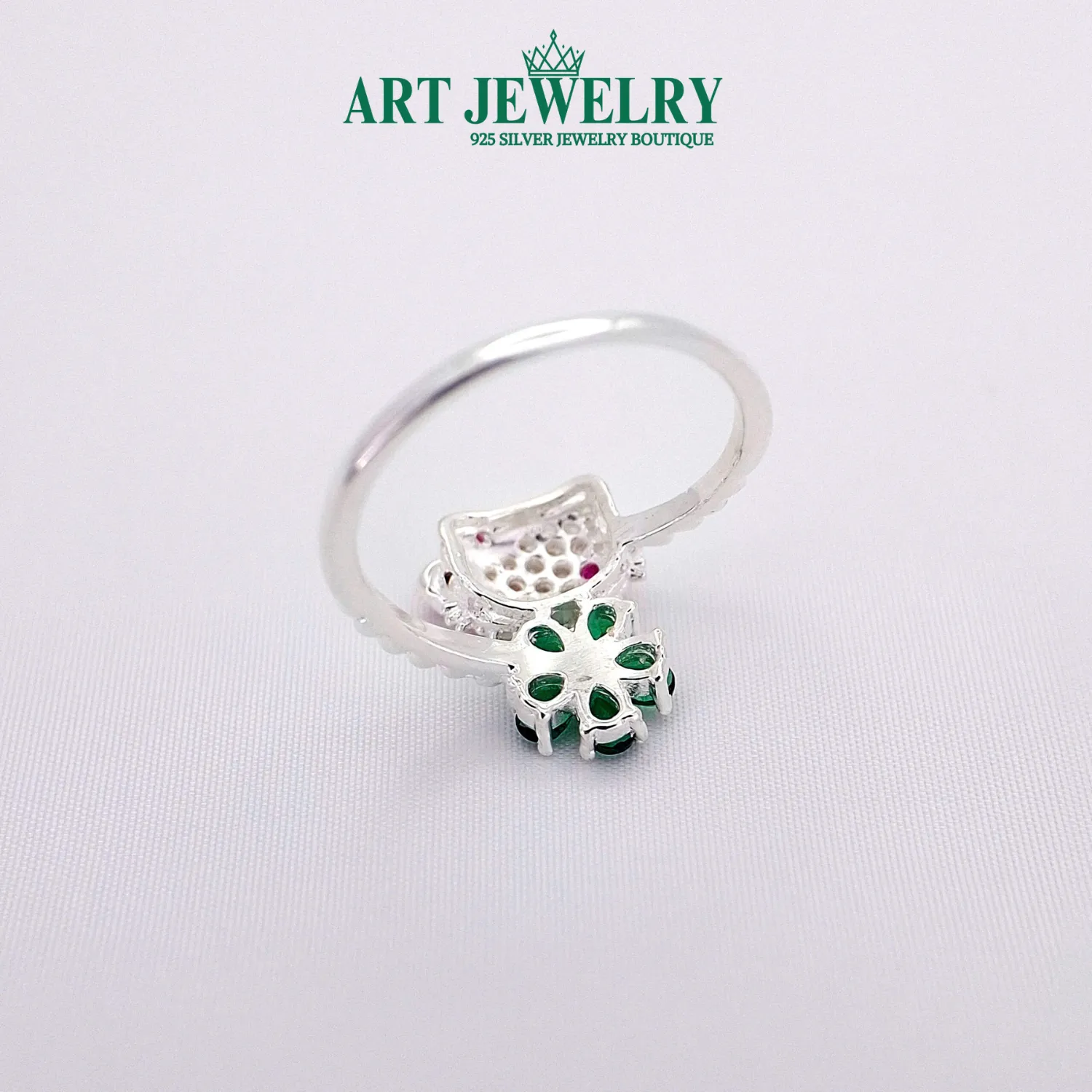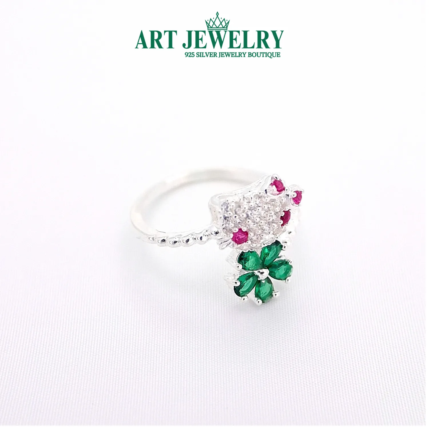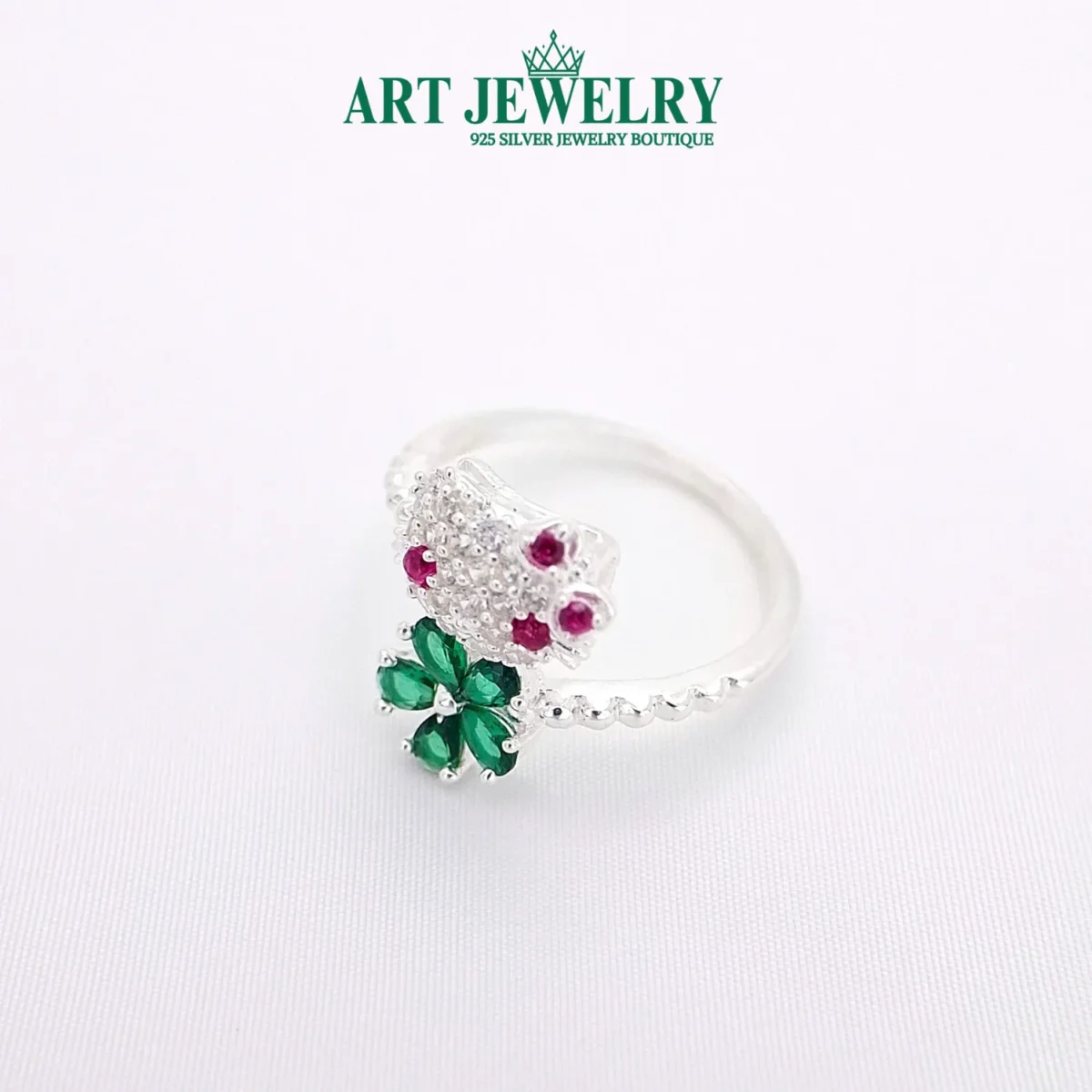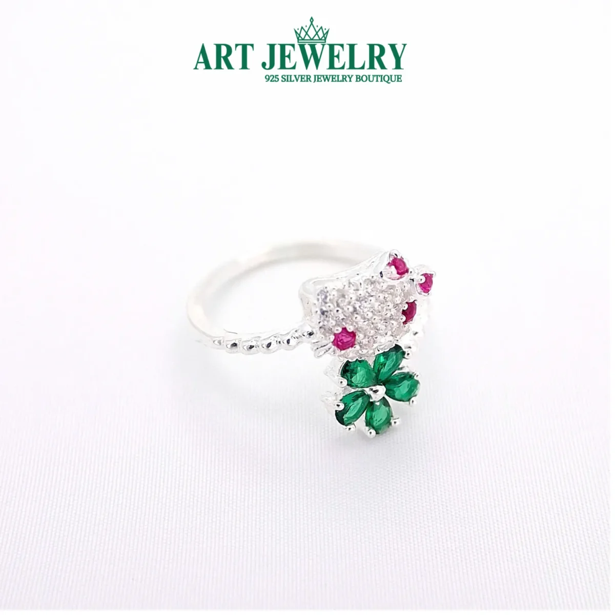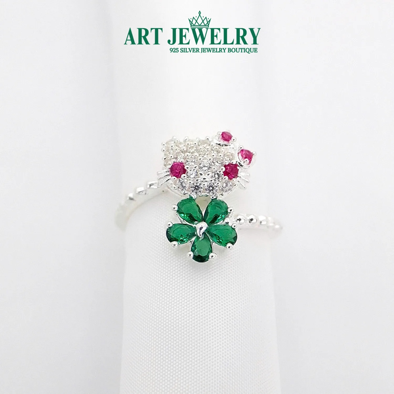 Chiếc nhẫn nhỏ nhắn được thiết kế riêng cho bé gái với hình mèo Kitty đáng yêu kết hợp cùng bông hoa màu xanh lá cây tươi tắn. Sản phẩm mang đến cảm giác vui tươi, ngọt ngào và đầy nữ tính, phù hợp với các bé yêu thích sự dễ thương và nổi bật. Nhẫn có kích thước nhỏ, ôm tay vừa vặn, là món quà lý tưởng cho các bé gái trong dịp sinh nhật, lễ hoặc đơn giản là để bé thêm rạng rỡ mỗi ngày.