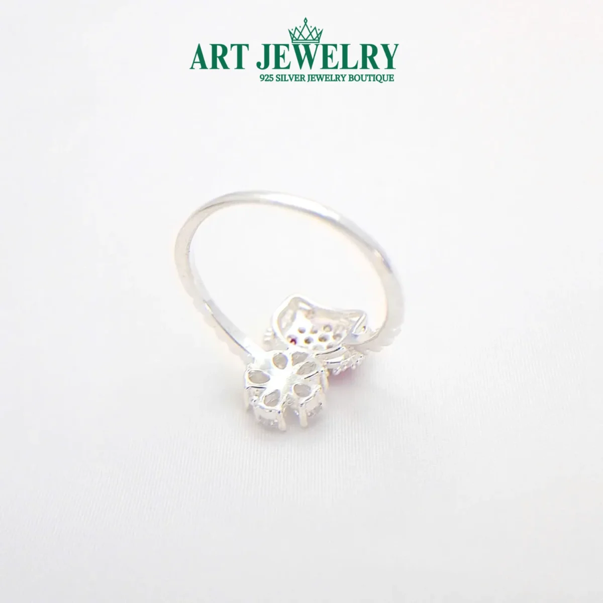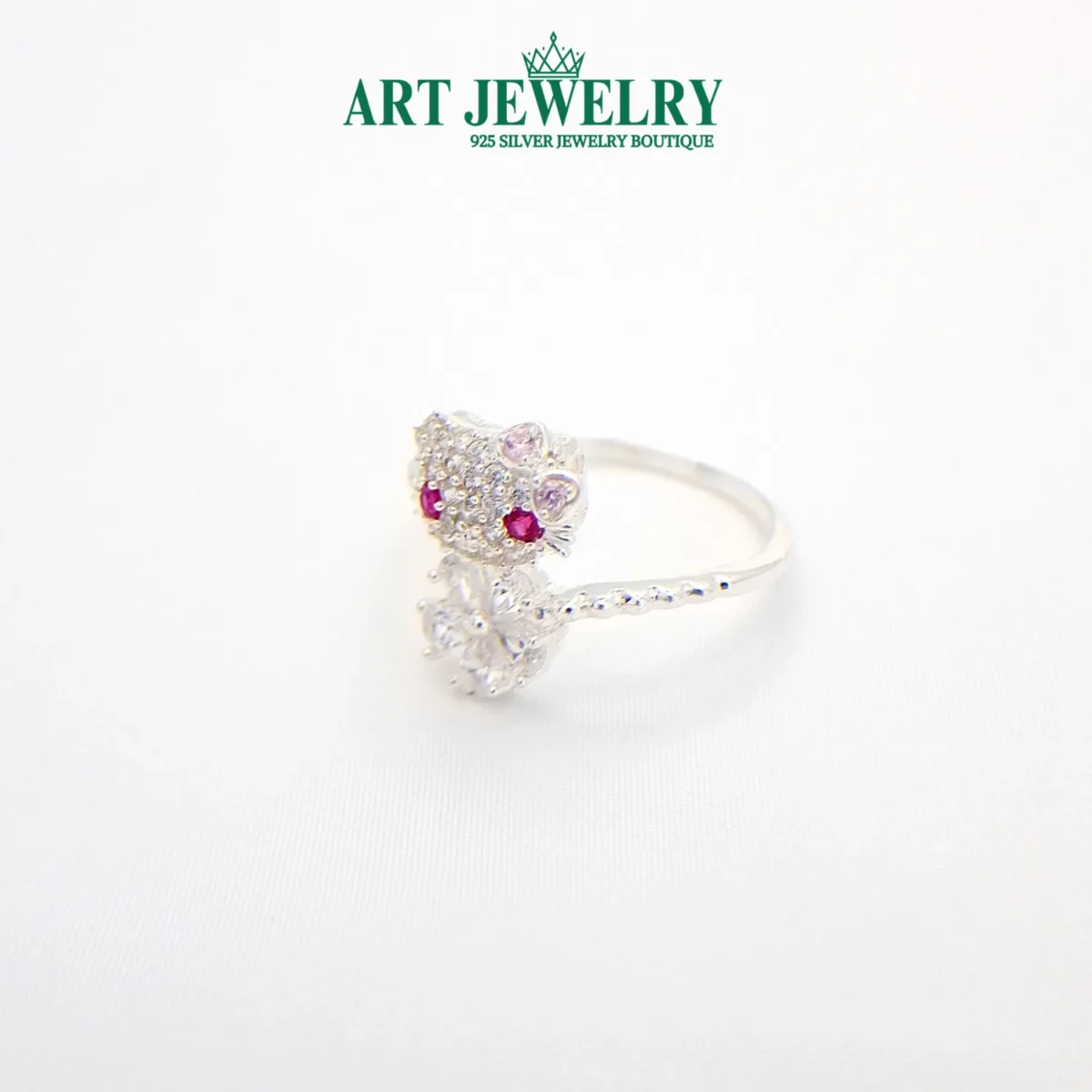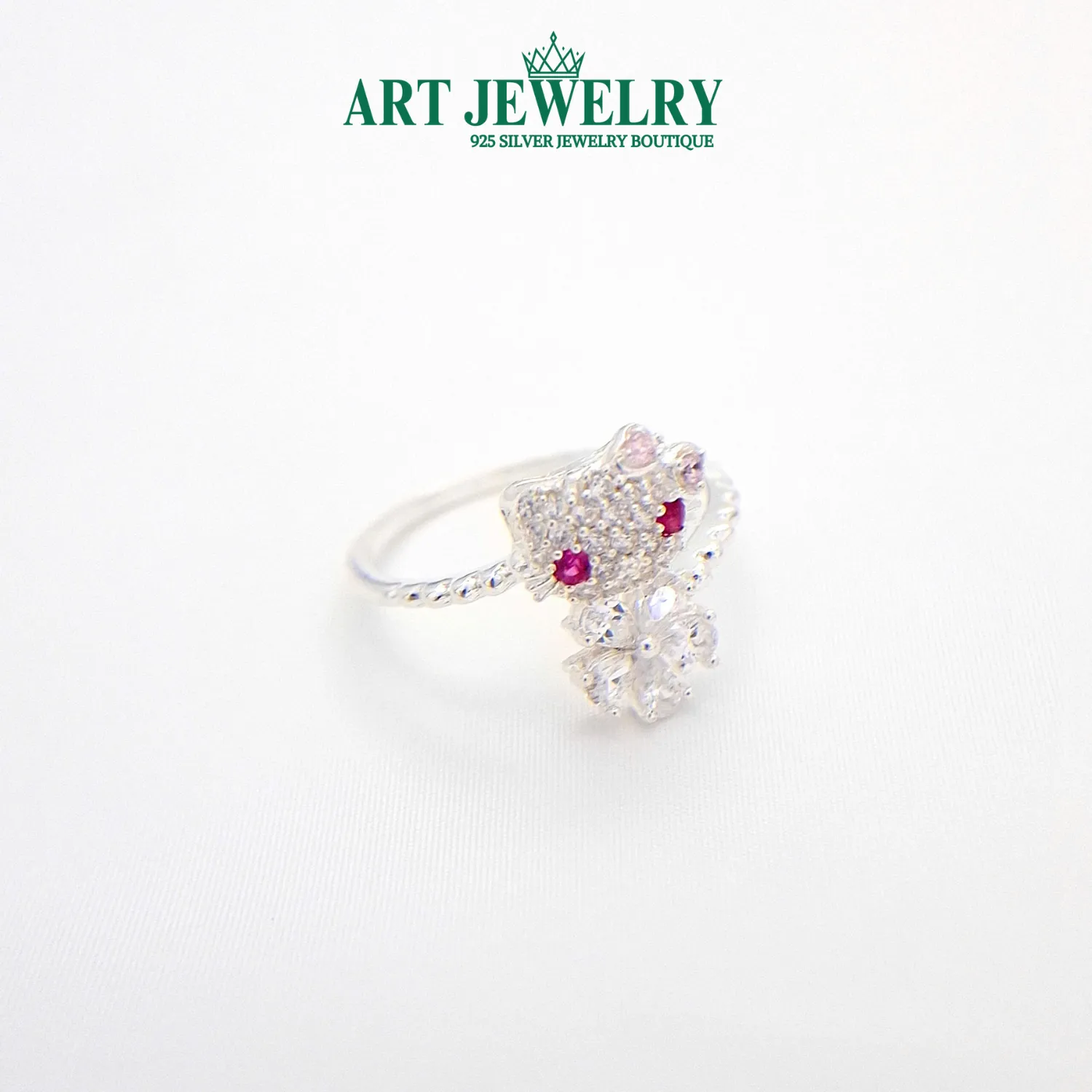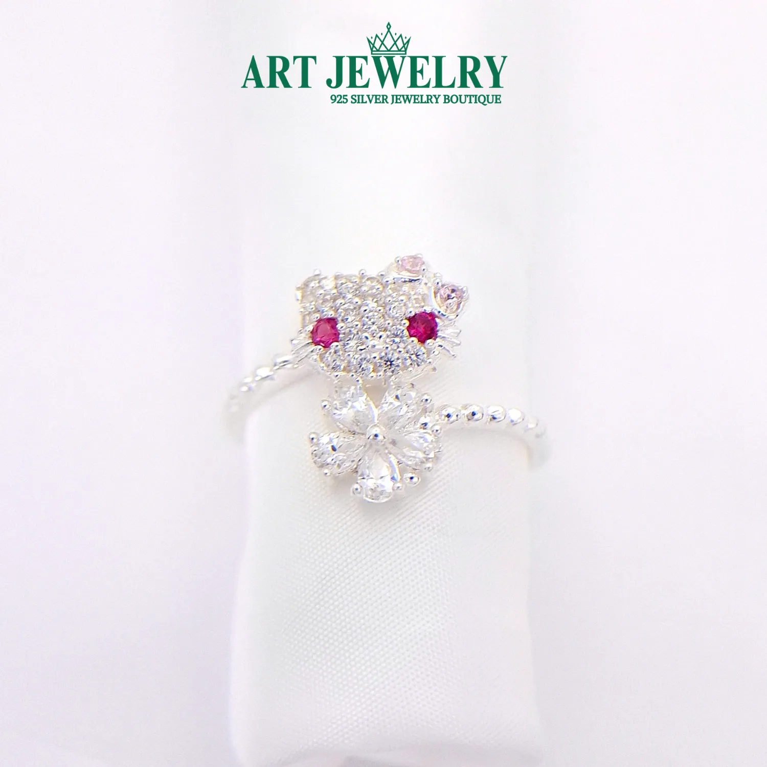 Nhẫn mèo kitty hoa xanh màu trắng