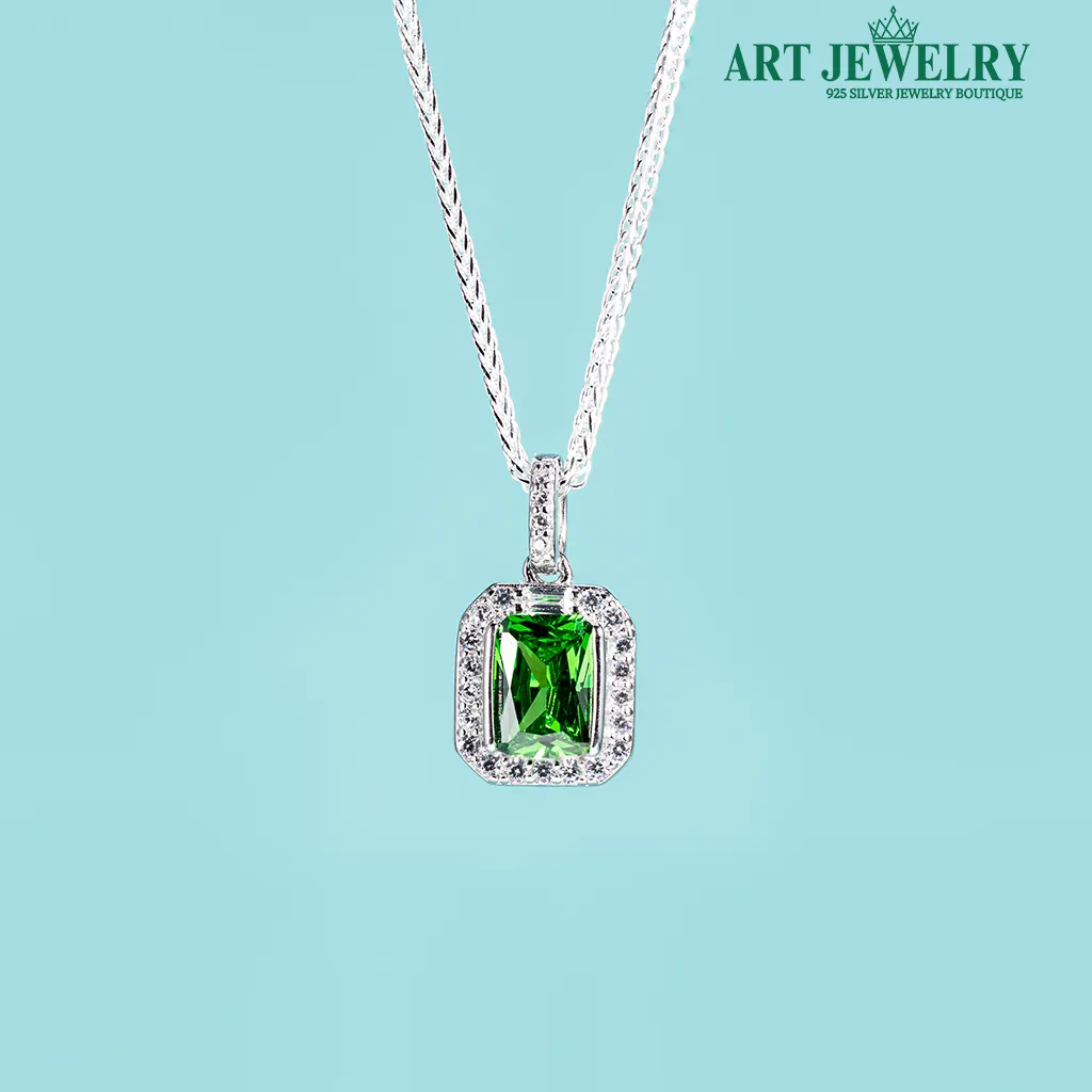 Dây chuyền xương cá Italy gắn mặt đá chữ nhật xanh lá cây bạc 925