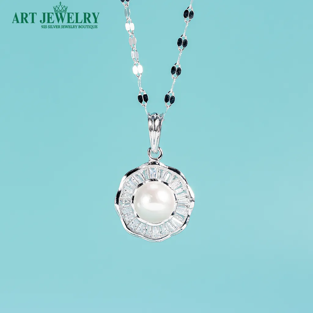 Dây chuyền trơn Italy gắn mặt ngọc trai viền đá baguette bạc 925