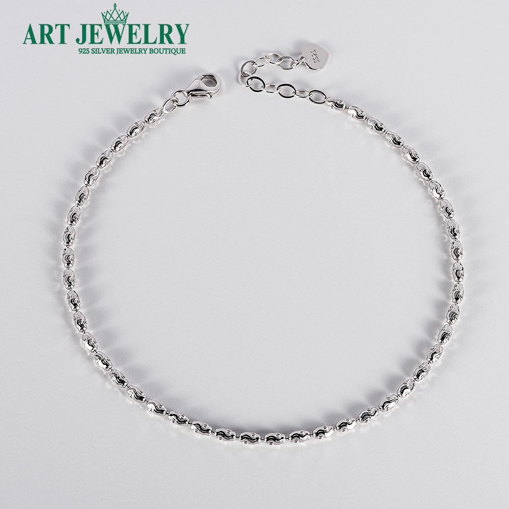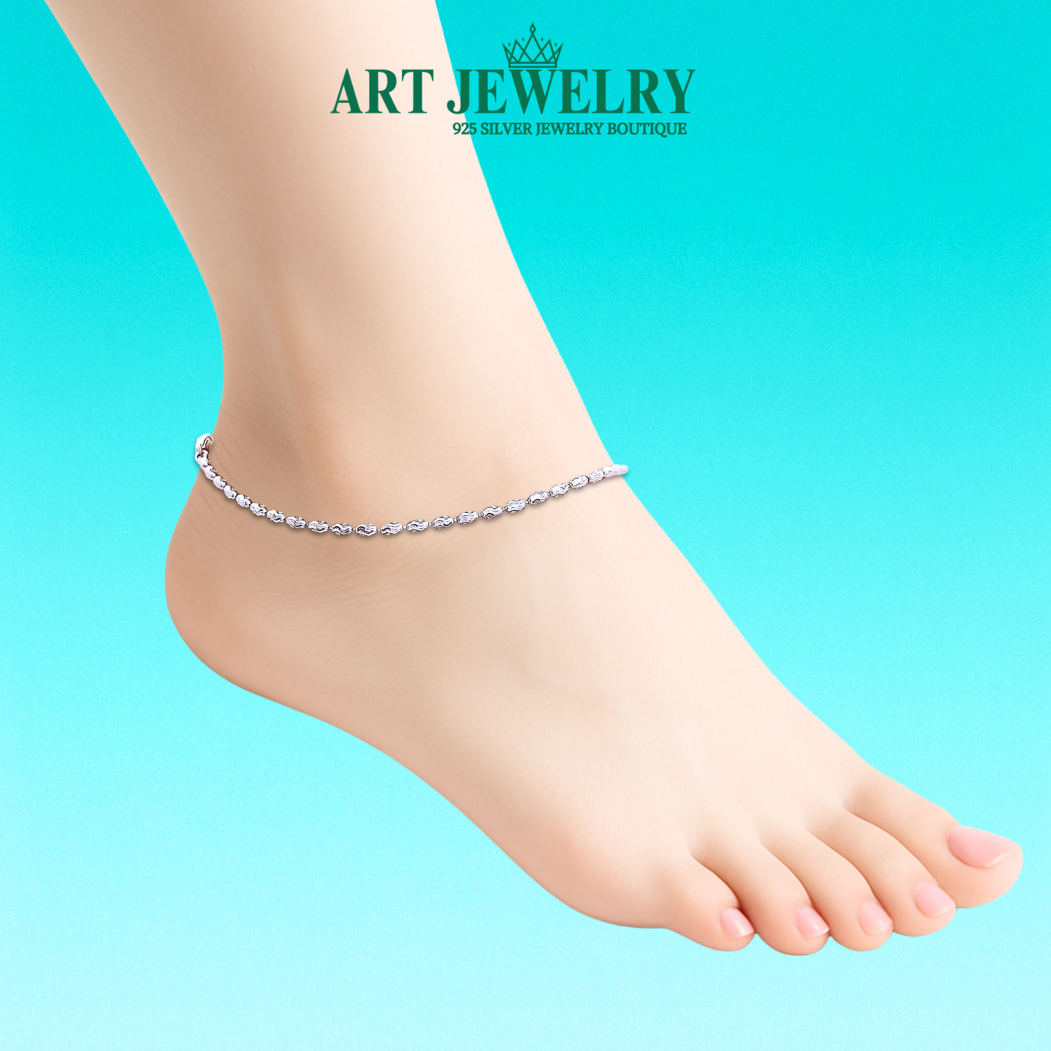 Lắc chân hạt cà na bạc 925 mang vẻ đẹp tối giản nhưng rất “ăn ảnh”. Dọc theo sợi lắc là các hạt cà na (dáng bầu/oval) được đánh bóng kỹ, bề mặt xi kim phản chiếu ánh sáng nhẹ nhàng giúp cổ chân trông thon gọn và nổi bật hơn. Kết cấu nhuyễn – mềm – mảnh cho cảm giác đeo thoải mái cả ngày, hạn chế rối khi di chuyển nhiều.