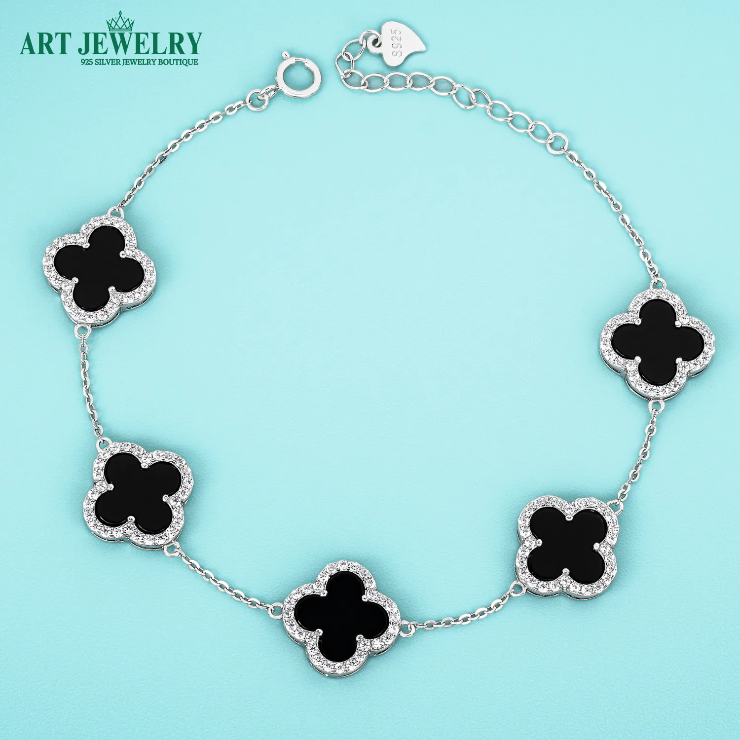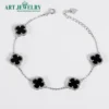 Lắc tay cỏ bốn lá đá đen 12mm viền CZ bạc 925 kết hợp nét tối giản thanh lịch với điểm nhấn mạnh mẽ từ tâm đá đen. Họa tiết cỏ bốn lá được tạo hình cân đối; phần trung tâm là đá màu đen, bao quanh bằng viền Cubic Zirconia (CZ) sáng trong, tạo tương phản đẹp mắt và hiệu ứng bắt sáng tinh tế. Chất liệu bạc 925 cùng lớp xi kim giúp bề mặt luôn sáng bóng, hạn chế xỉn màu và dễ vệ sinh khi đeo thường xuyên.