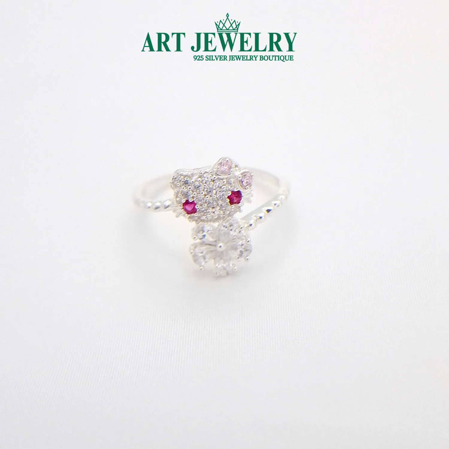 Nhẫn mèo kitty hoa xanh màu trắng